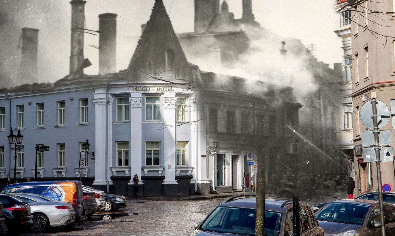 Sulatatud fotod. Vana-Sepa ja Suur-Karja rist. Pommitamine. Originaal: K. Eerme. Eesti Rahvusarhiiv. FOTO: Sander Ilvest / Postimees